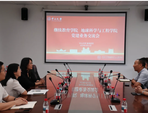 学院党支部首先与地球科学与工程学院开展党建业务交流。座谈会上,地球科学与工程学院党委书记孔晓慧介绍了学院的党建成果及工作经验,尤其是“一融双高”广东省党建工作样板支部培育创建情况,结合学院发展历程和概况,期望两院联合开展非学历教育现场教学基地建设,共同开拓新的培训领域、培训项目。